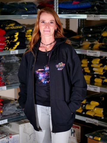 | Dámská mikina s kapucí na zip a dvěma kapsami Grafický motiv je umístěn na zádech, malý motiv medvědí hlavy vpředu 100 % bavlna |