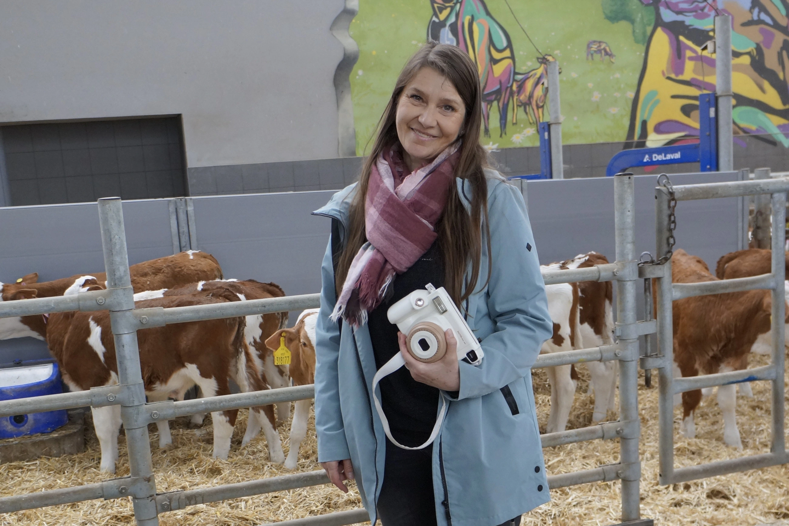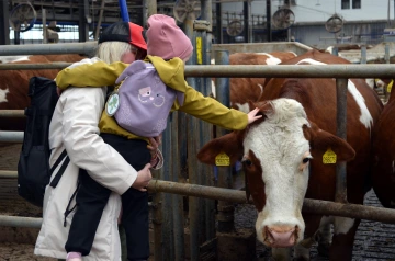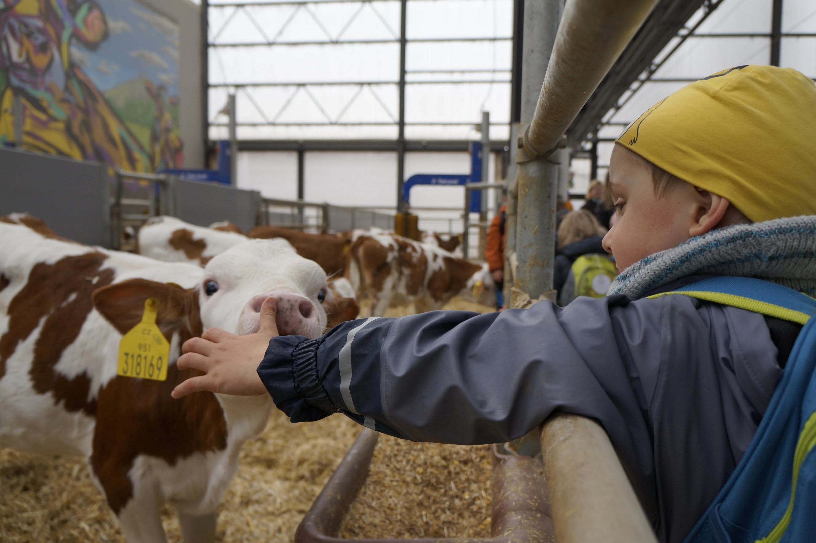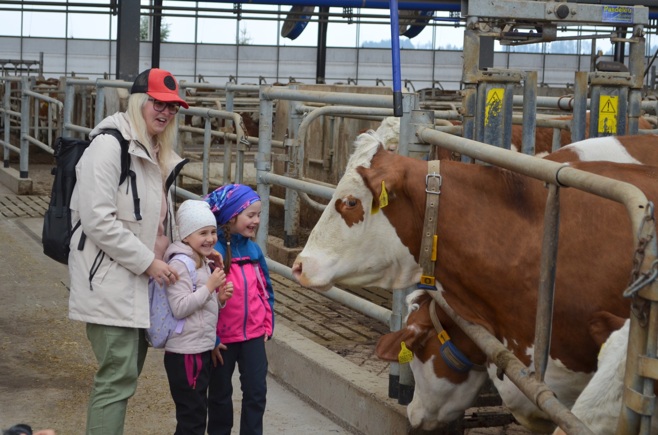 Po krátké svačině na čerstvém vzduchu se všichni přesunuli do robotické stáje. Tady si děti prohlédly březí krávy a nejvíce času strávily u telátek, která si mohly i pohladit. Aby si od nás odnesly i hezkou vzpomínku, každého jsme s telátkem vyfotili na Instax.