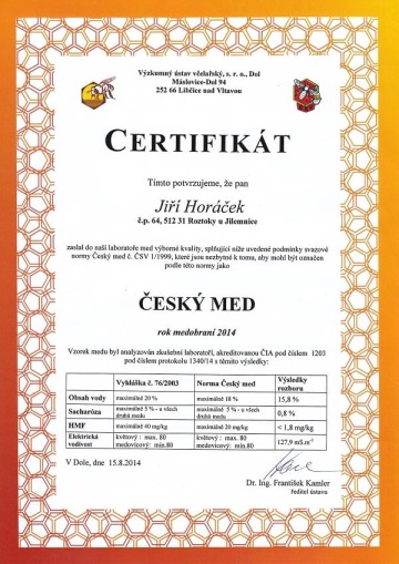 Ve čtvrtek 7. července jsme se pustili do vytáčení druhého medovicového medu a průměrně jsme vytočili 10kg na včelstvo. Vzorek medu jsme poslali do Výzkumného ústavu včelařského, kde byl med důkladně analyzován. Na základě výsledků jsme v těchto dnech obdrželi certifikát kvality, který zaručuje, že náš med splnil všechny podmínky, aby mohl být označován „ČESKÝ MED“.