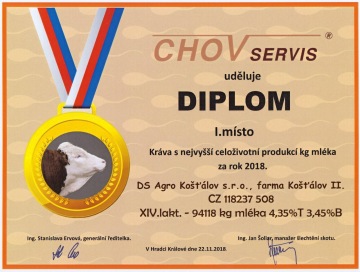 Naše nejstarší kravička "Prcek" letos opět získala ocenění za celoživotní užitkovost. S přehledem obhájila svůj loňský titul, ke dnešnímu dni nadojila již 94118 kg mléka, za což jí patří první místo. Děkujeme tímto ošetřovatelům z koštálovského K2 za jejich důkladnou péči o ní. Daří se jí stále skvěle, právě se pokouší již o šestnáctého potomka. Přejeme "Prckovi" hodně zdraví a další úspěchy.