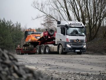 Po zimní přestávce to zase roztočíme na stavbě obchvatu v Nové Pace. Nejdříve tam ale dovezeme těžkou techniku. Na fotkách nakládáme bagr Doosan v lomu Smrčí.