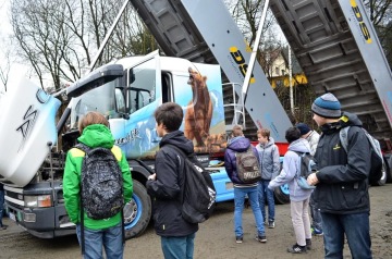 Pozvání na tento „Den otevřených dveří“ přijaly Masarykova základní škola Libštát a Základní škola F.L. Riegra ze Semil a účastnilo se ho zhruba třicet žáků. Den jsme zahájili stručnou prezentací firem DS Holding a Střední školy technické a řemeslné Nový Bydžov. Vzápětí následoval výjezd do provozů. Žáci navštívili dispečink DS Logistic, kde se dispečeři rozpovídali o jejich práci. Další zastávkou byla bioplynová stanice v Bělé, kde jim byl stručně přiblížen princip fungování tohoto ekologického zařízení. Následně si prohlédli dvě odchovny mladého dobytka (v Bělé a na Kamínce) a hlavně, na co se těšila asi většina, byla technika. K vidění byly jak zemědělské stroje (traktory, kombajn, řezačka), tak tahače Volvo a Scania a v neposlední řadě i stroje našich kluků z DS Logistic (Bobcat s hlavicí Nisula, kráčející bagr Kaiser).