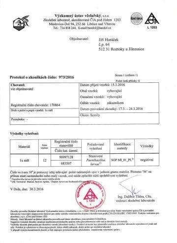 Včelstva jsme rovněž nechali vyšetřit na možnou přítomnost moru včelího plodu. Výsledek získaný Výzkumným ústavem včelařským byl negativní. Toto vyšetření bylo nezbytné, pokud budeme chtít přesouvat včelstva mezi obcemi. Protokol je k vidění níže.