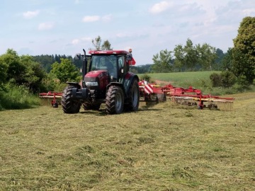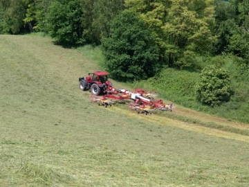 V souvislosti se senážními pracemi jsme zapůjčili techniku od firmy Agrotip - Široký s.r.o. Jednalo se o čtyřrotorový shrnovač Pöttinger, který jsme využili zhruba na týden práce, cena za půjčení činila 500 Kč/den. Velkou předností tohoto stroje je snadno hydraulicky nastavitelný pracovní záběr od 8 – 12,5 m, což představuje značnou výhodu oproti našim dosavadním dvěma shrabovačům s pracovním záběrem 6,5 m. Tento stroj splnil naše očekávání, stíhal všem třem sběracím vozům a v našich kopcovitých podmínkách se osvědčil.