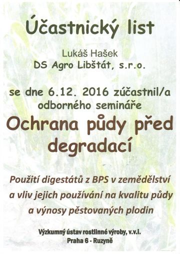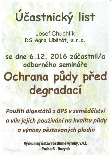 V minulém týdnu se pan Josef Chuchlík a Lukáš Hašek zúčastnili semináře pořádaného Výzkumným ústavem rostlinné výroby v Ruzyni na téma: