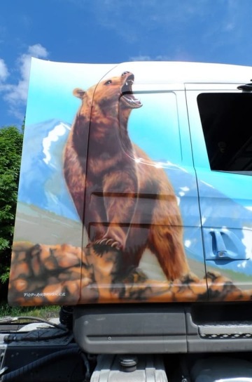 Po domluvě termínu se bílá nudná Scania dovezla do dílny pana Galla a on se mohl pustit do díla. Čekaly ho ještě četné úpravy povrchu a příprava pro samotnou malbu, poté už jen hurá do práce na tom našem veledíle. Časově malba zabrala šest dní po cca 14 hodinách. Pro nanesení obrázku byla použita technika zvaná airbrush. Jedná se o jemnou techniku nanášení barev s možností vytvářet různé motivy, obrazy a barevné přechody. Pro malbu jsou použity akrylátové autolaky a krycí bezbarvé laky s UV filtrem zaručující stálobarevnost a odolnost proti poškození.