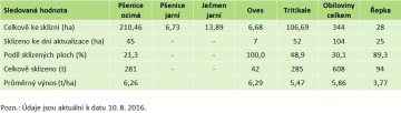 Letošní sklizeň obilnin jsme zahájili 5. srpna. Do boje vyrazily dva kombajny – E514 a E517, neboť ostatní stroje pomáhaly se sklizní v jiných podnicích. Následně se přidaly ještě další dvě E517 a z neděle na pondělí se nám vrátil i nejvýkonnější Gomselmash GS12. V plné sestavě se nám podařilo sklidit v pondělí zhruba 28 ha tritikale, 10 ha řepky a 39 ha pšenic. Údaje o průběžné sklizni k dnešnímu dni vidíte níže na tabulce (hodnoty společné pro DS Agro Libštát i DS Agro Košťálov).